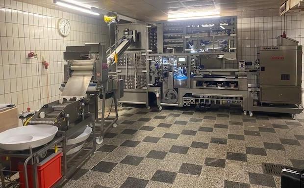 Dazu kam ein integrierter Langroller und eine Queraustragung mit Doppellaufförderband für die ebenfalls angeschlossene UNIVERSUM LWT Wickelanlage mit Handaufarbeitungstisch zur Herstellung gewickelter oder langgerollter Produkte sowie Teigflecken für Handsalzstangen. Optional kann auch der KÖNIG Wasserbadmohner MOC 300 angestellt werden.